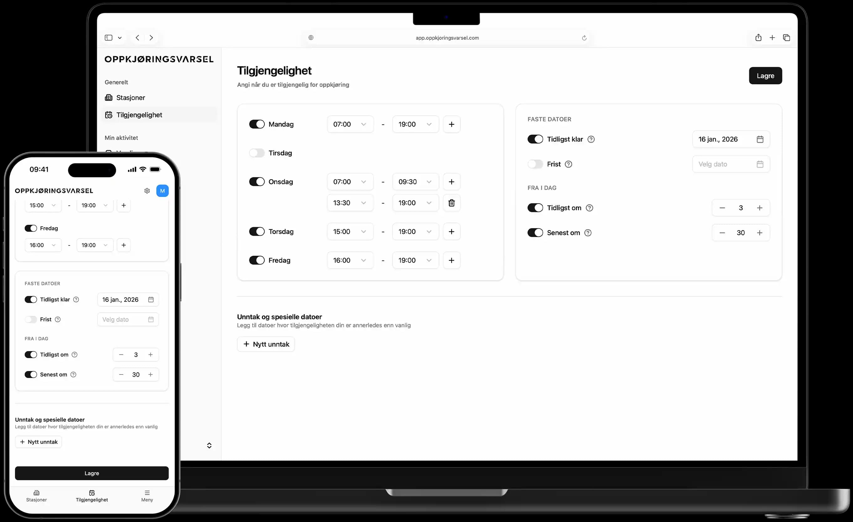 Velg hvilke dager og tider du faktisk er tilgjengelig for oppkjøring. Mandag morgen passer ikke? Da slipper du varsler om de timene.