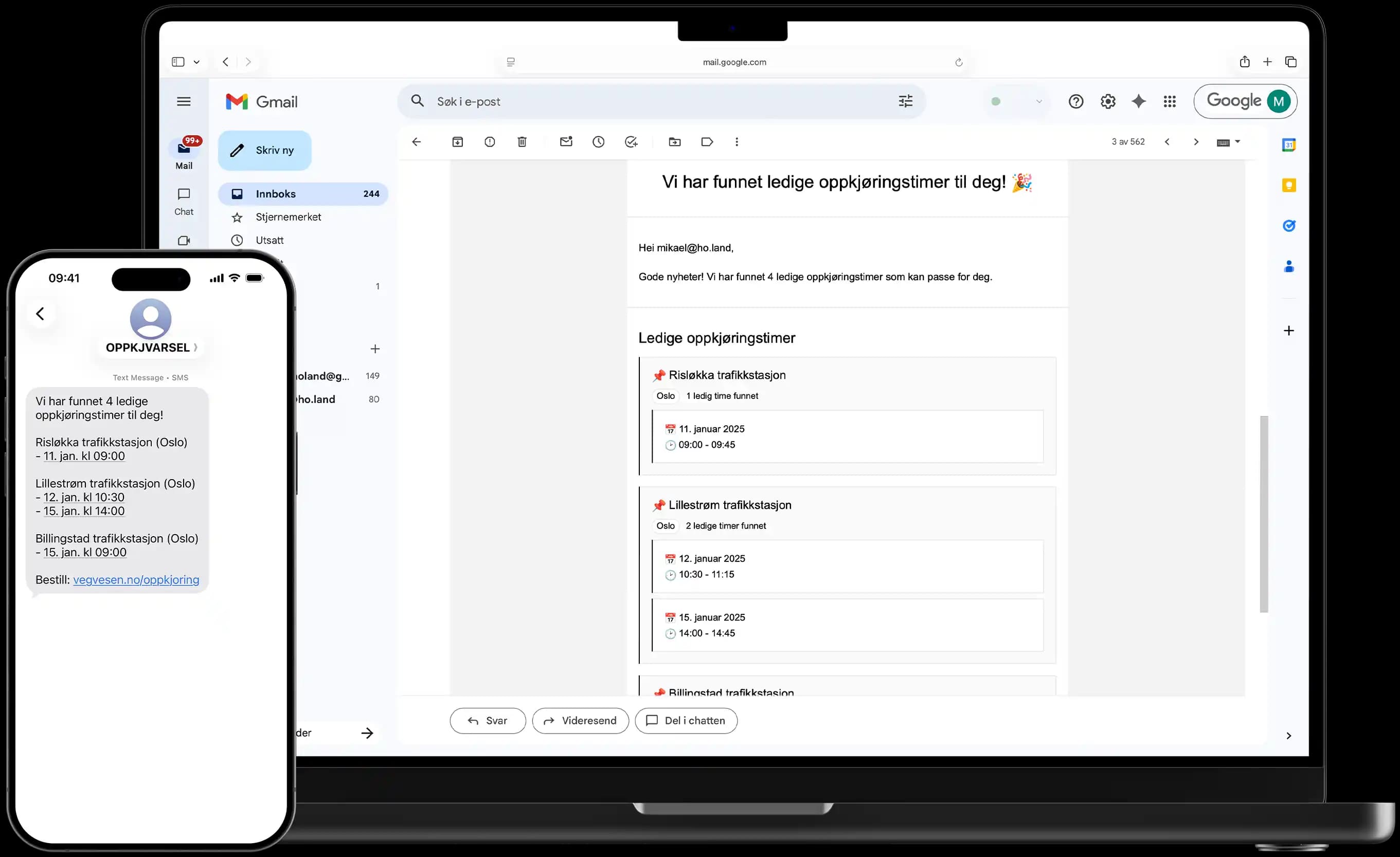 Slipp å sjekke Statens vegvesen manuelt. Vi overvåker ledige oppkjøringstimer og varsler deg på SMS eller e-post med en gang det dukker opp en ledig oppkjøring.