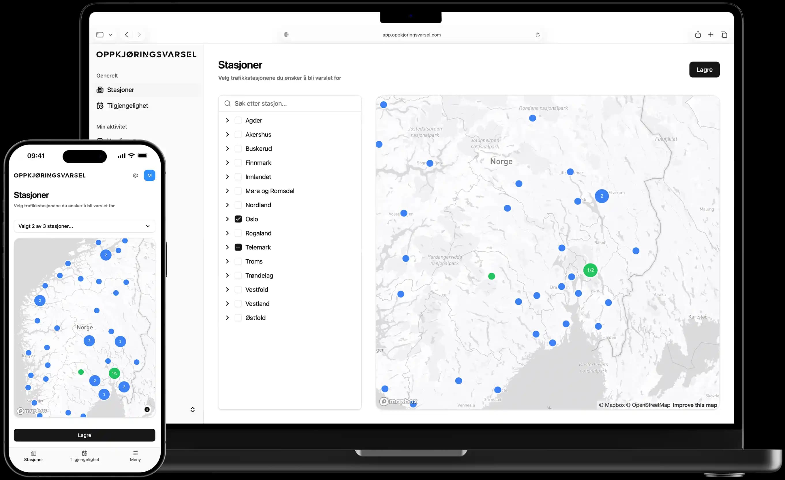 Se alle trafikkstasjoner i Norge på et interaktivt kart. Klikk på stasjonene du vil overvåke for oppkjøring - så gjør vi resten.