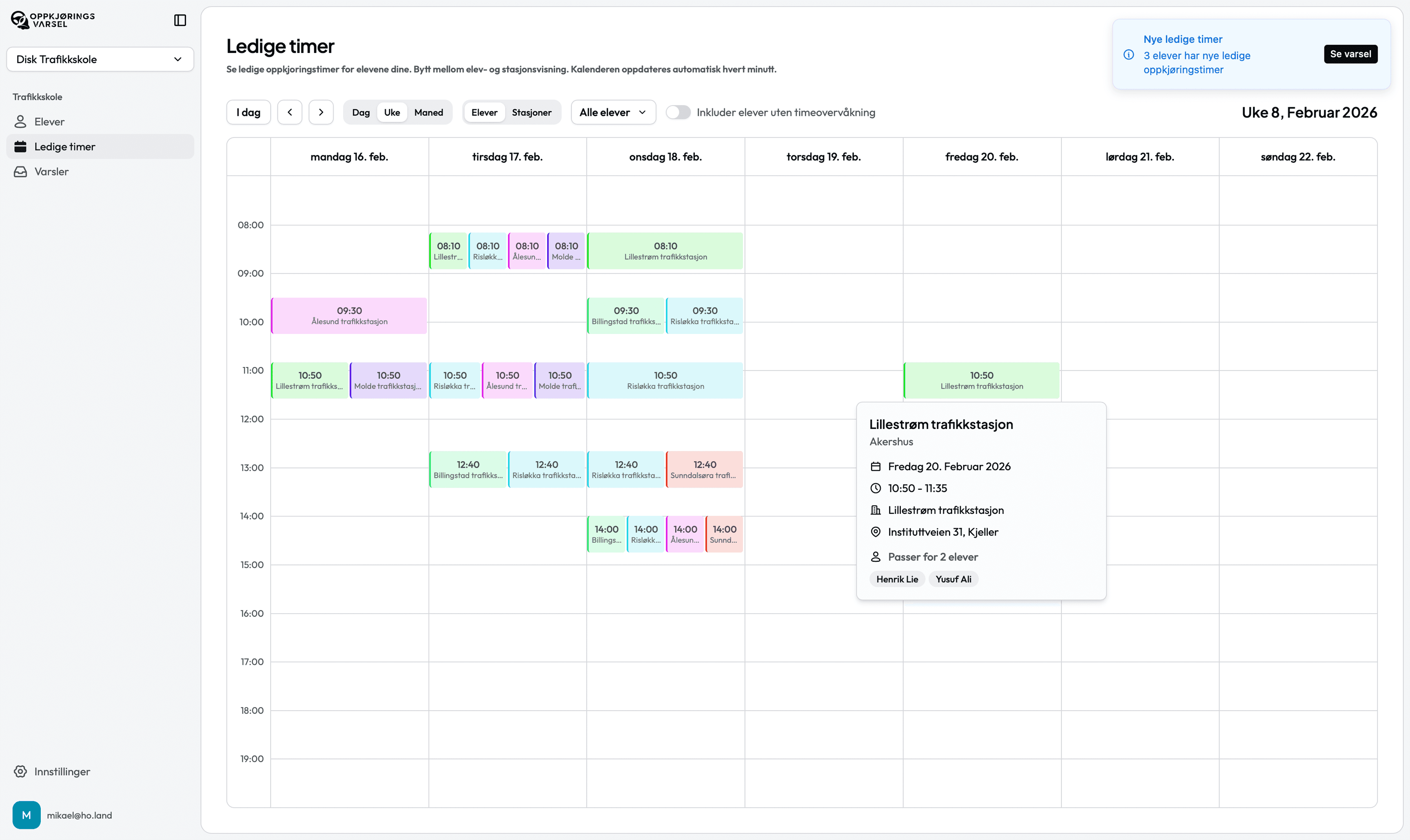 Se alle ledige timer som matcher elevenes preferanser i en oversiktlig kalender. Filtrer per elev eller stasjon.